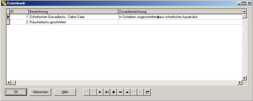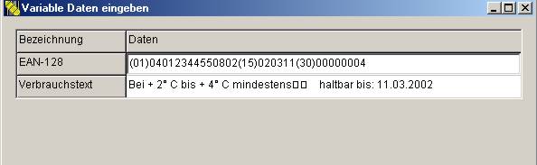 In den Feldern Daten können die Inhalte der Objekte nun geändert werden. Für die Eingabe von EAN-128 Werten beachten Sie: Wie wird der EAN-128 mit mehrern Gruppen als Barcode eingegeben? Sollte eine Datenbank definiert sein, so wird nun die entsprechende Tabelle angezeigt. Aus dieser Tabelle können Sie den gewünschten Satz auswählen. Die entsprechenden Felder werden nun mit den Daten aus der Tabelle ersetzt und am Bildschirm angezeigt. Die Zuordnung der Felder einer Tabelle erfolgt in den Eigenschafts-Fenstern der Objekte. Hier muss die Option Datenbank ausgwählt werden, sowie die Tabelle aus der Liste. |