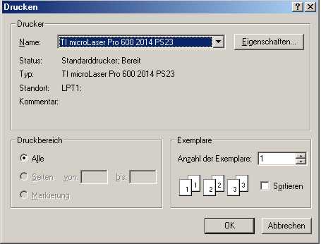 Nun erst wird das Drucken-Fenster angezeigt. Hier kann noch die Menge und andere Einstellungen eingegeben werden. |